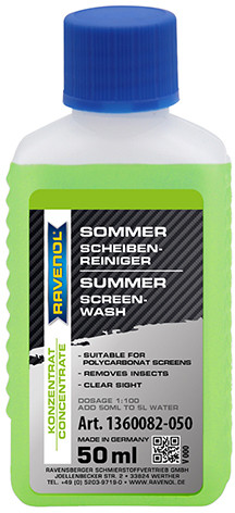 RAVENOL Sommer-Scheibenreiniger 1: 100 (Konzentrat) – концентрат летней стеклоомывающей жидкости, изготовленной в Германии, для применения в автомобилях в пропорции смешивания 1:100. Предназначена для удаления следов насекомых, различных загрязнений, обеспечивает чистоту фар, лобового и заднего стекол автомобиля.