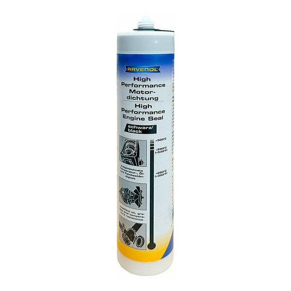 RAVENOL High Performance Motordichtung — это термостойкий герметик (от -60°C до +280°C и до 300°C в течение до 2 часов). Материал на основе ацетата не содержит растворителей, устойчив к давлению, обладает высокой адгезией и чрезвычайно эластичен, с удлинением при разрыве 500%, при этом его основная консистенция пастообразная.