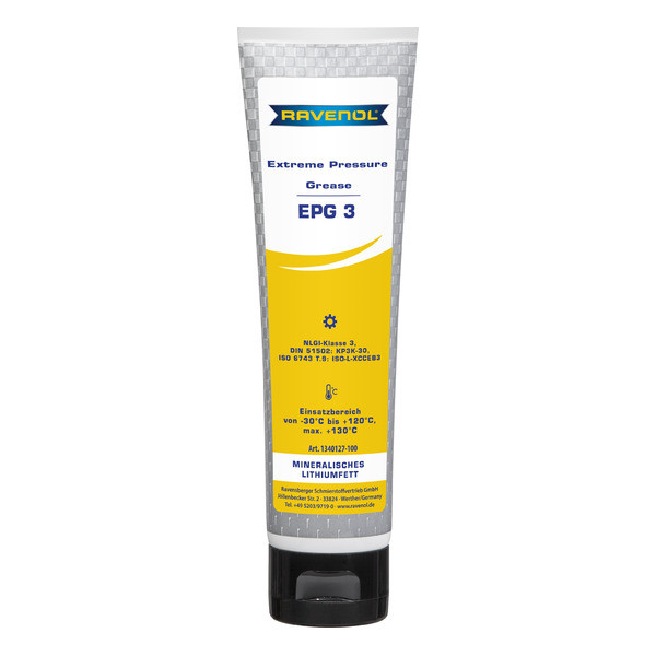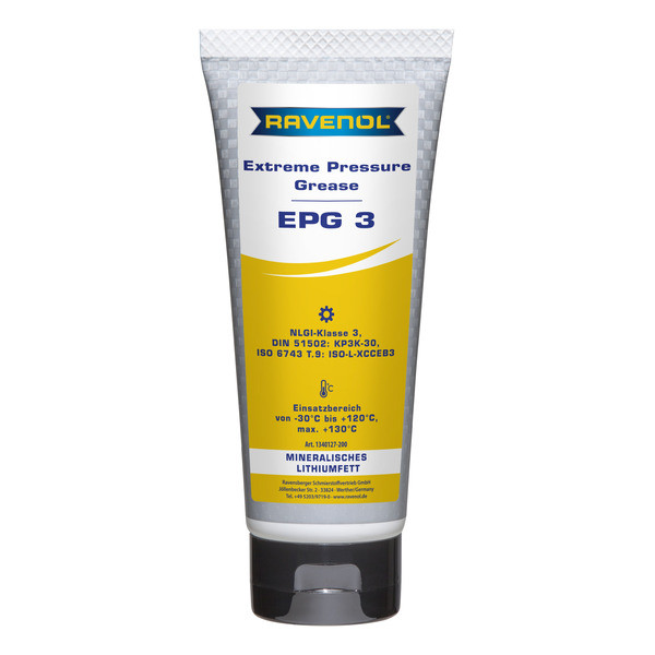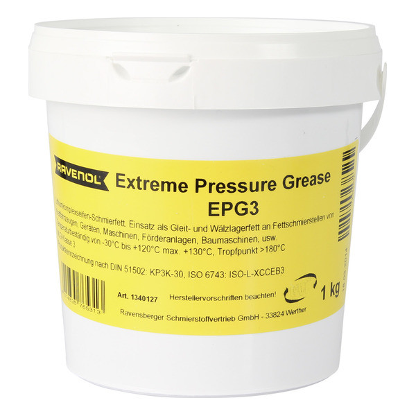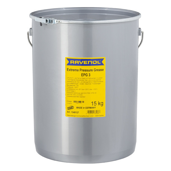 RAVENOL Extreme Pressure Grease EPG3 - автомобильная смазка на минеральной основе, загущенная литиевым мылом для подшипников скольжения, качения автомобилей, механизмов, устройств, конвейерных установок, строительной техники и т.д. Стабильность к вытеканию, защита от коррозии и ржавчины.